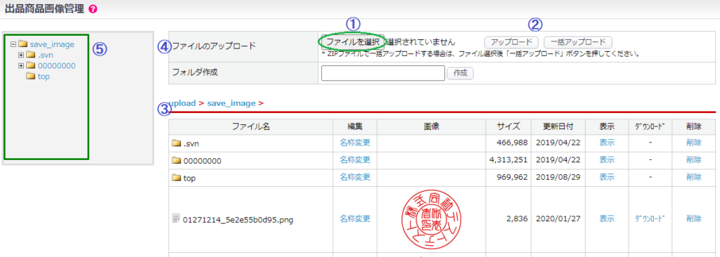 指定のフォルダ内に保存するには、指定のフォルダ名と内部が③表示されていることを確認し、画像データをアップロードする。