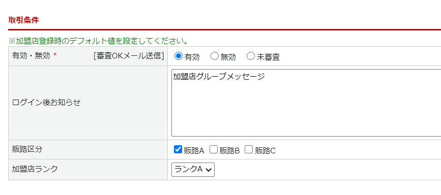 | 販路区分 | ※登録した内容は、この加盟店グループに新しく加盟店を紐づけた場合の 「加盟店>加盟店登録」画面「取引条件」欄にあらかじめ設定されます。