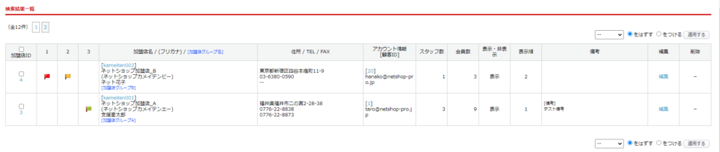 登録された加盟店が検索条件に基づいて一覧表示されます。