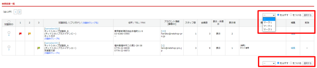 「加盟店>加盟店登録」画面右上にて加盟店別に内部管理用のマークを任意で設定できます。※複数設定可
