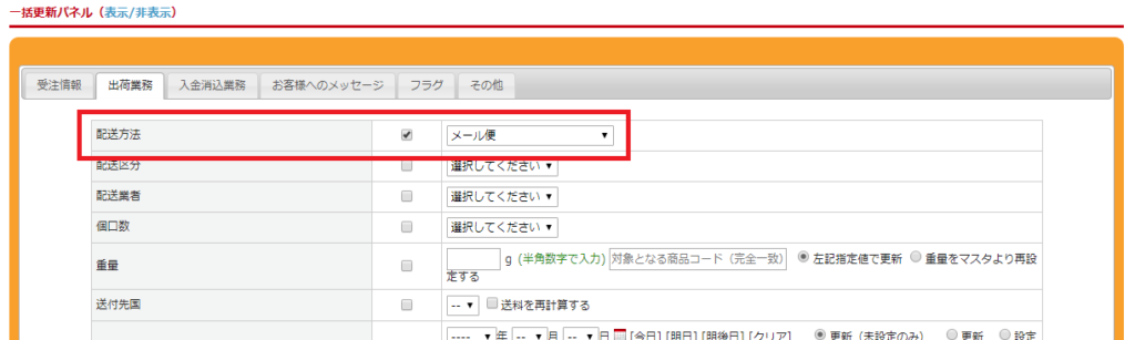 まだ発送されていない受注に絞り込み、一括更新パネルにて配送方法を変更してください。
