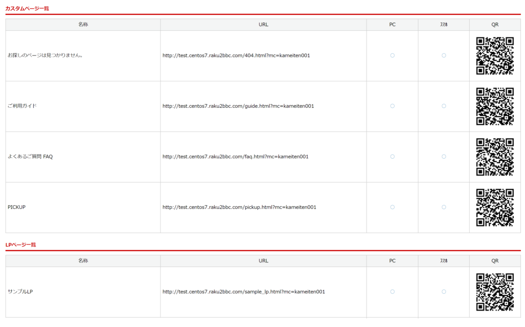 登録されているカスタムページとフォーム一体型LPへ遷移するQRコードとURLが表示されます。