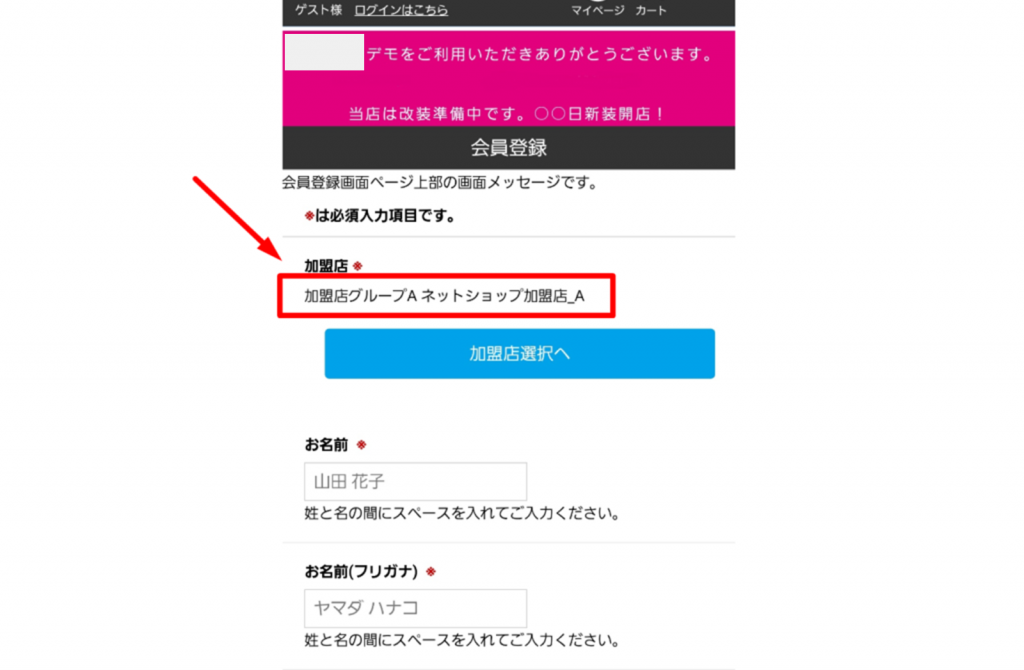 「ネットショップ加盟店_A」を指定した状態の会員登録画面へ遷移します。