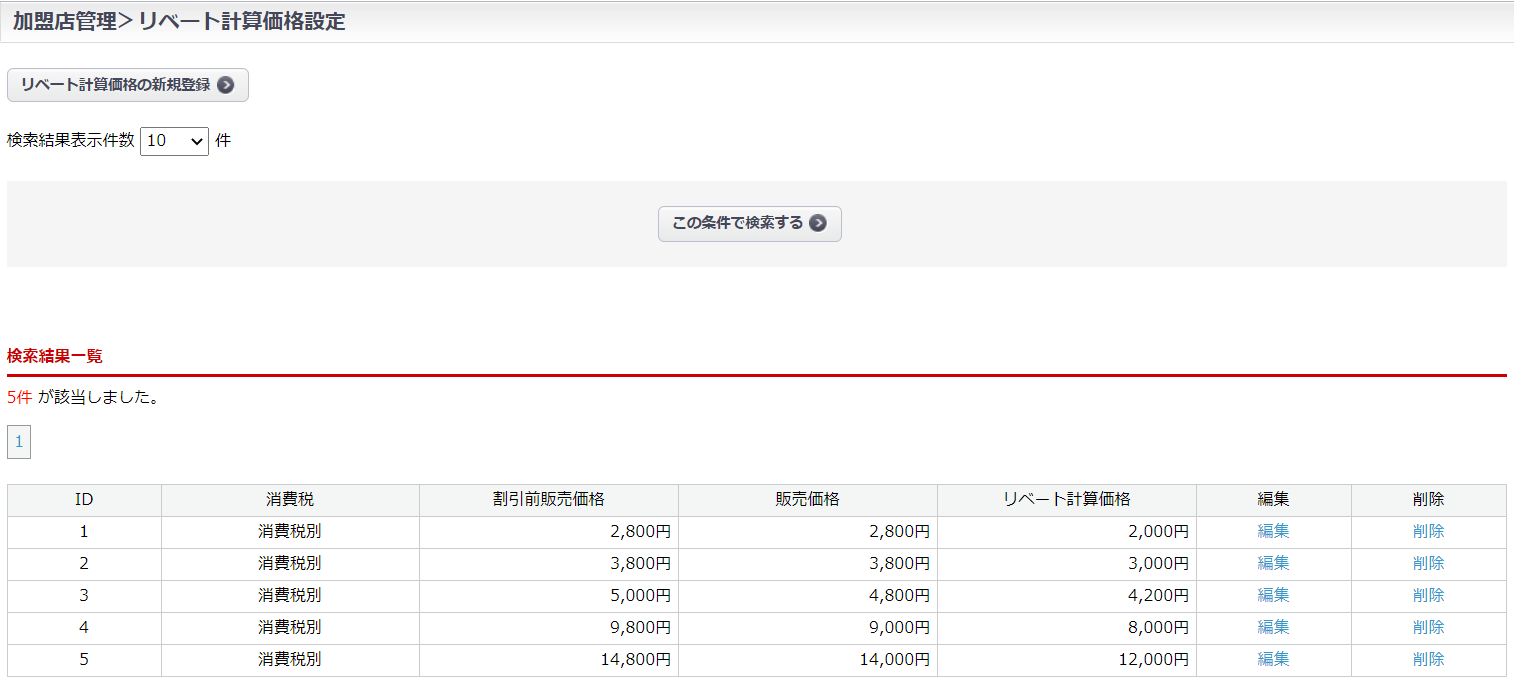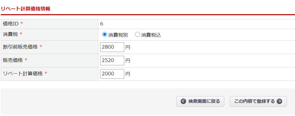 | リベート計算価格 | 手数料計算の基準となる価格を指定します。 指定した価格は「加盟店>リベート支払管理」における手数料計算に使用されます。 詳しくはこちらをご覧ください。 ※売価の20%を手数料としたい場合、売価から20%分差し引いた金額を指定します。 |