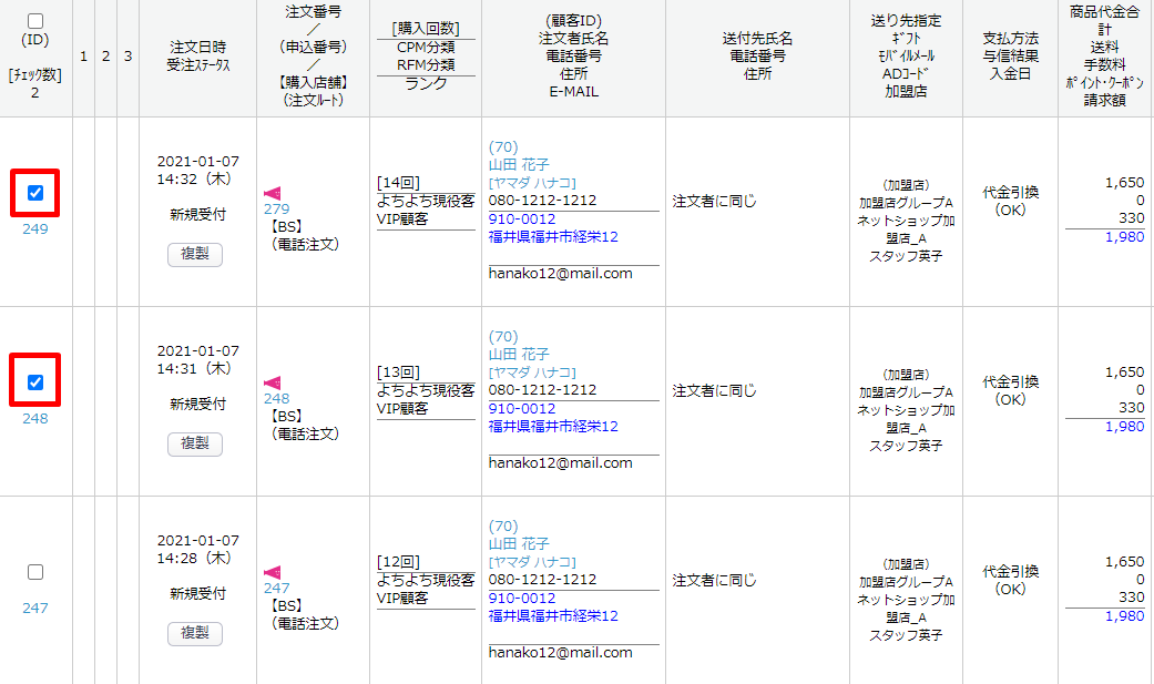 検索結果一覧にて、出力対象とする受注データの「ID」欄にチェックを入れます。