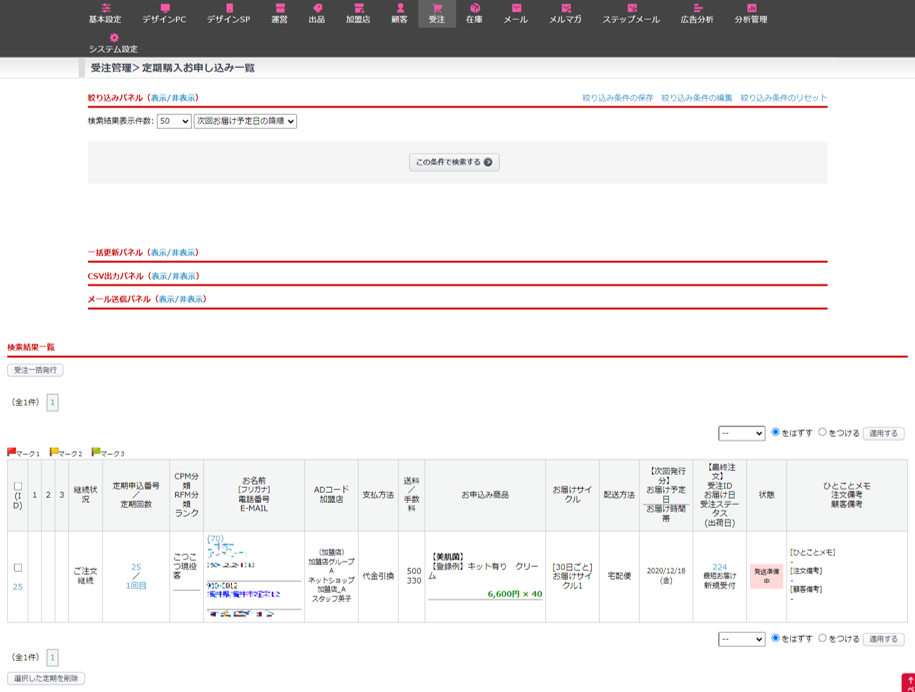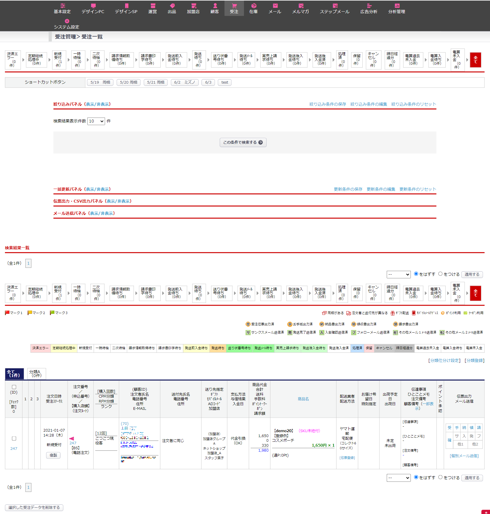 メール送信パネル、検索結果一覧等の機能により受注データの管理を行います。