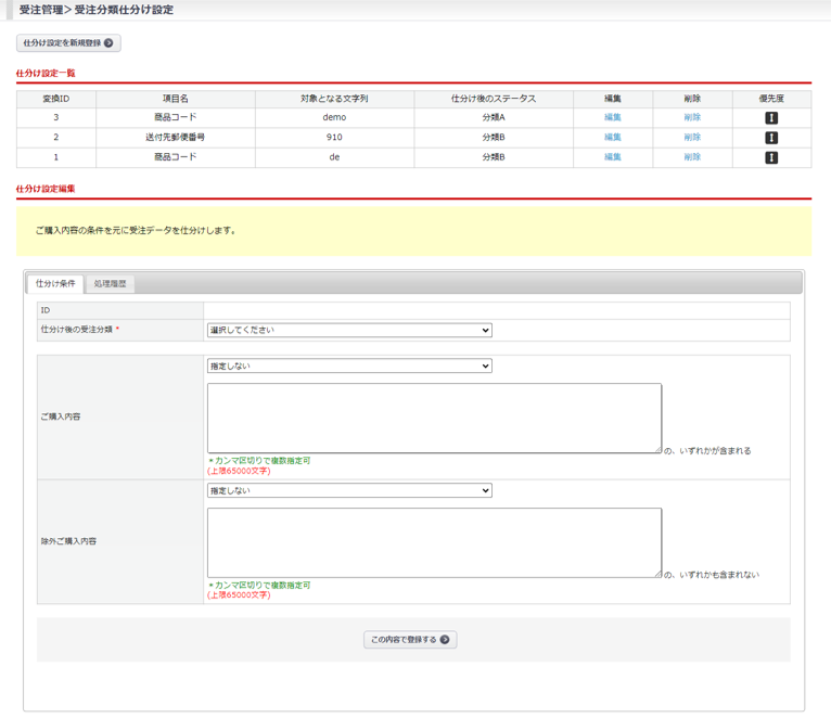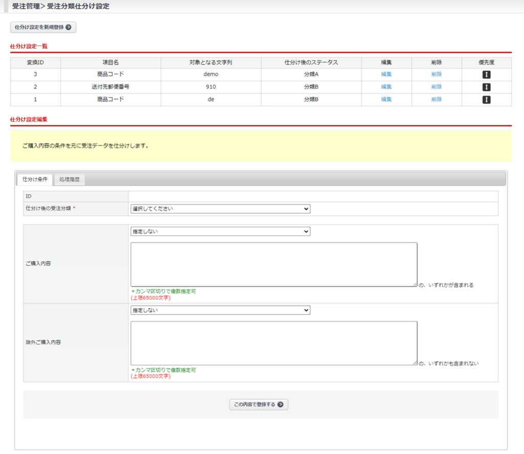 受注ステータスとは異なる軸で受注データを分類できる受注分類を設定する画面です。