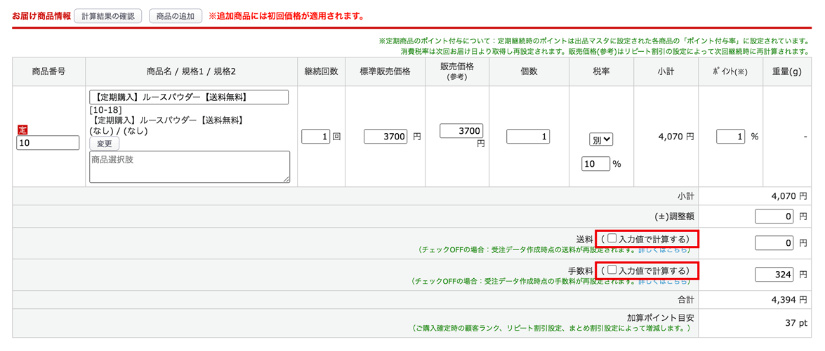 定期お申込み情報のお届け商品情報で送料、手数料の「入力値で計算する」にチェックが
