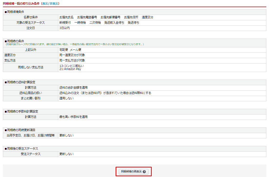 [名寄せ・同梱設定]タブで設定した条件が表示され、【同梱候補の再表示】ボタンをクリックすると、内容に当てはまる候補一覧が表示されます。