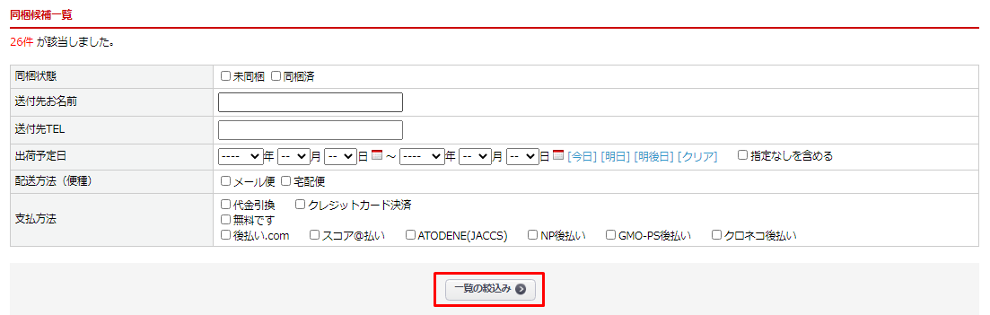 【同梱候補の再表示】で一覧表示した候補の中から、さらに候補を絞り込むことが可能です。