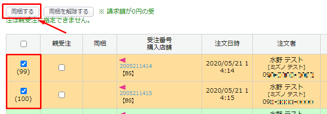 で設定した条件に従い、受注データの同梱候補を表示させて、同梱処理をすることが出来ます。