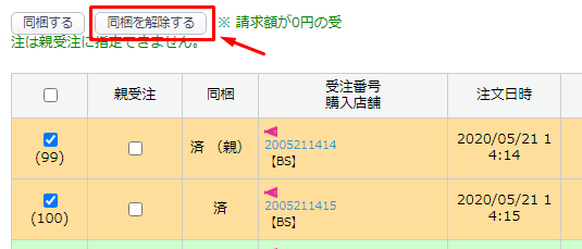 受注>同梱候補一覧 から、同梱を解除したい受注IDにチェックを入れて、【同梱を解除する】ボタンをクリックします。