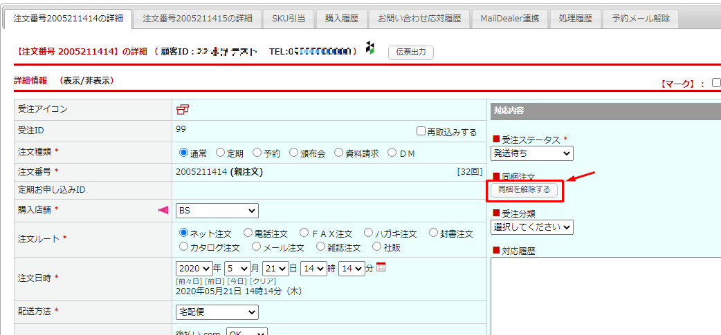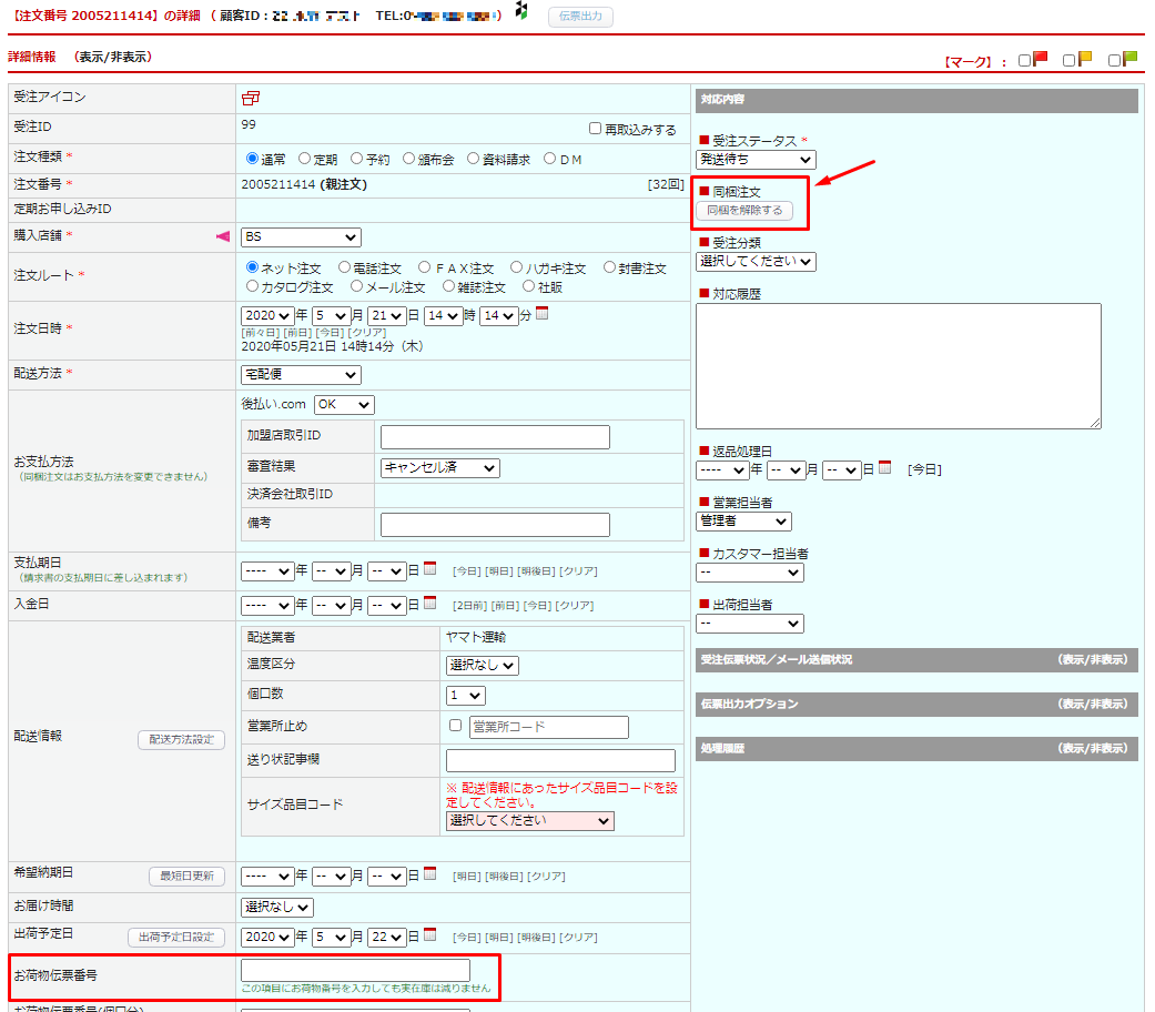 ※同梱解除後、お荷物伝票番号は削除されたままなので、再度取り込む必要があります。