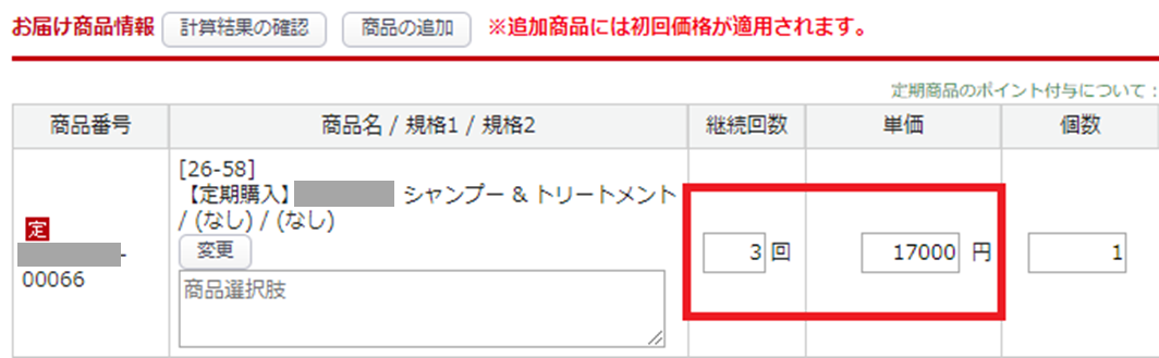 継続回数「0回」、単価は初回価格がセット