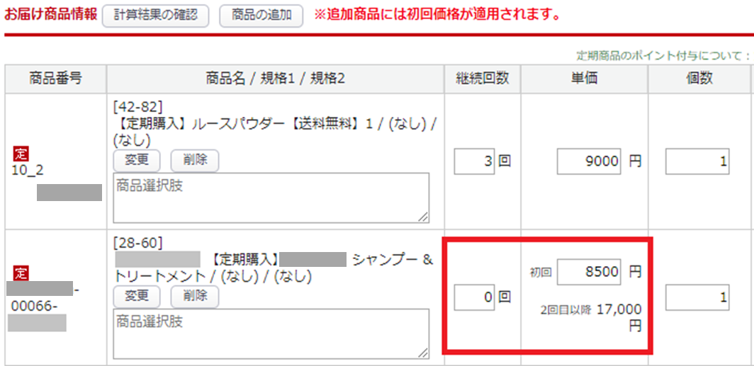 継続回数0回および初回価格がセットされます。