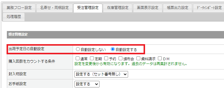 基本設定>管理システム設定>[受注管理設定]タブ 「出荷予定日の自動設定」より設定可能です。