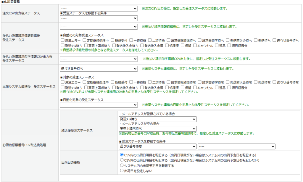 | 後払い決済請求印字情報CSV 出力後 受注ステータス | 後払い請求印字情報CSV出力後の移動先受注ステータスを指定します。 |