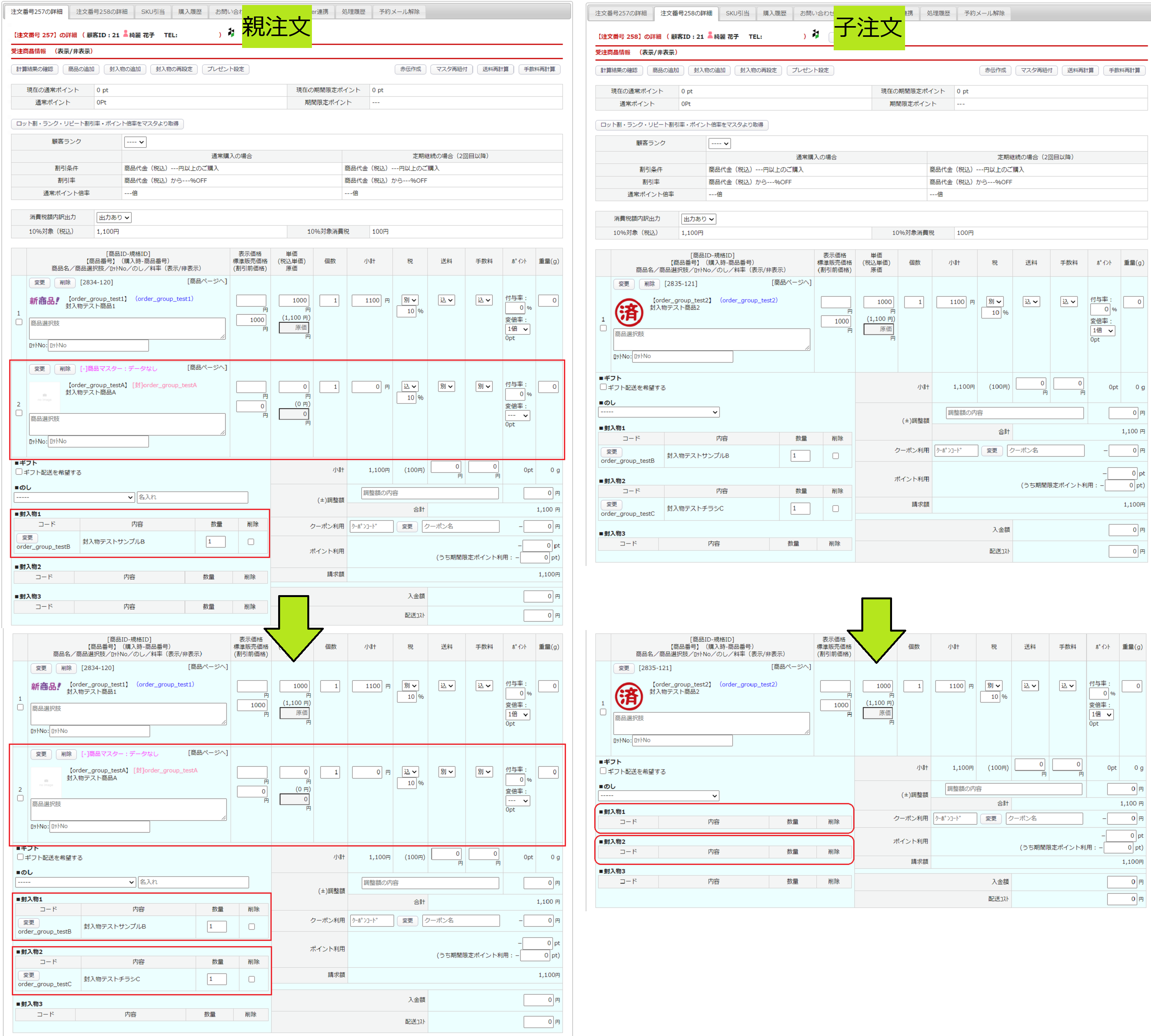 同梱した親注文の「受注商品情報」にて【封入物の再設定】ボタンをクリックすると、