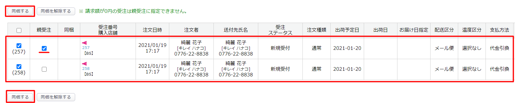 同梱したい受注のIDと親受注側にチェックを入れて、一覧上部または下部の