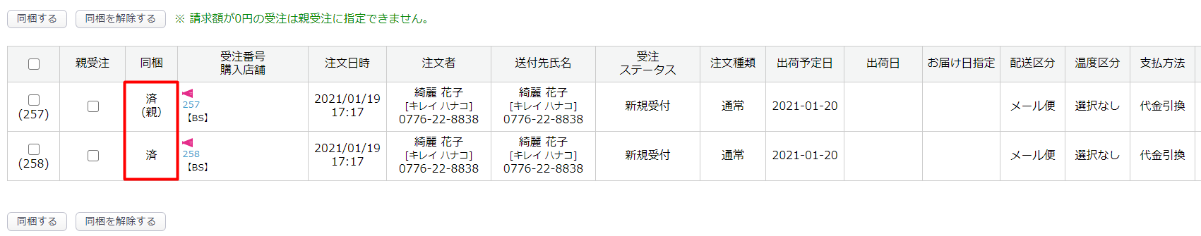【同梱する】ボタンをクリックすると同梱処理されます。