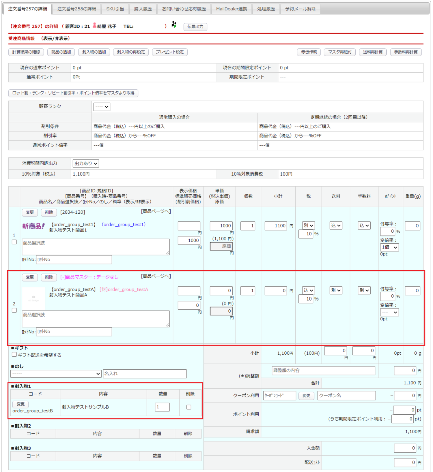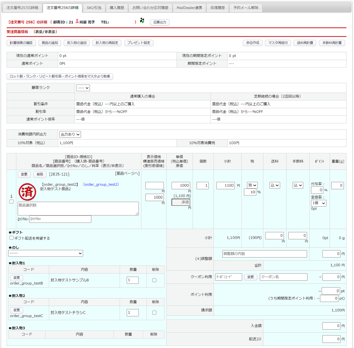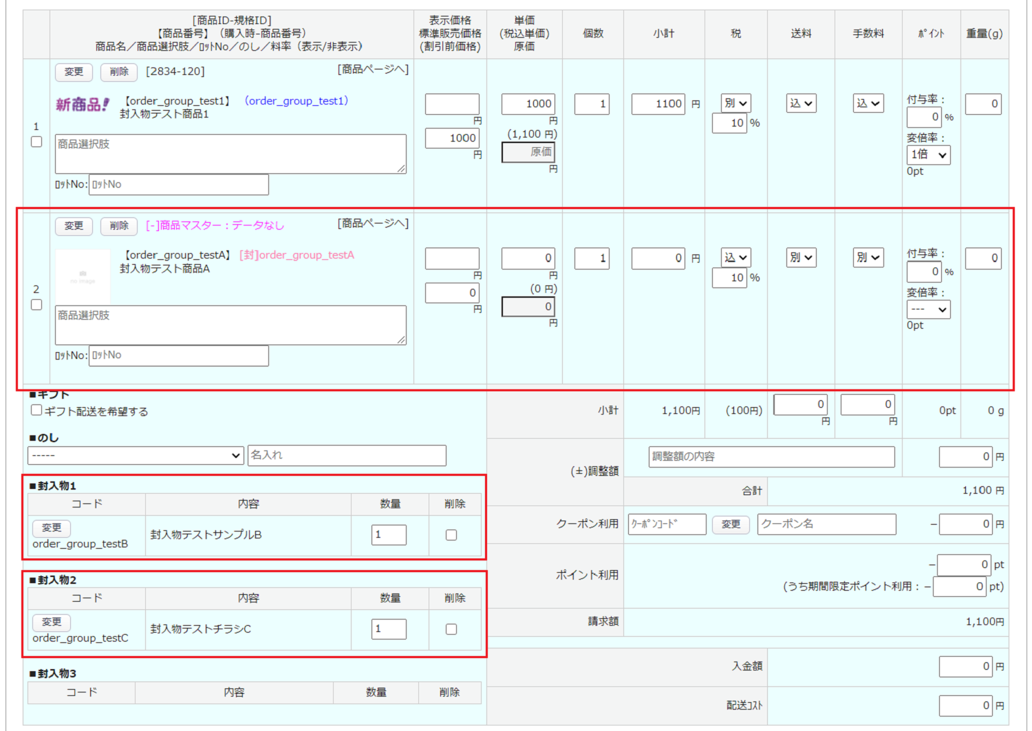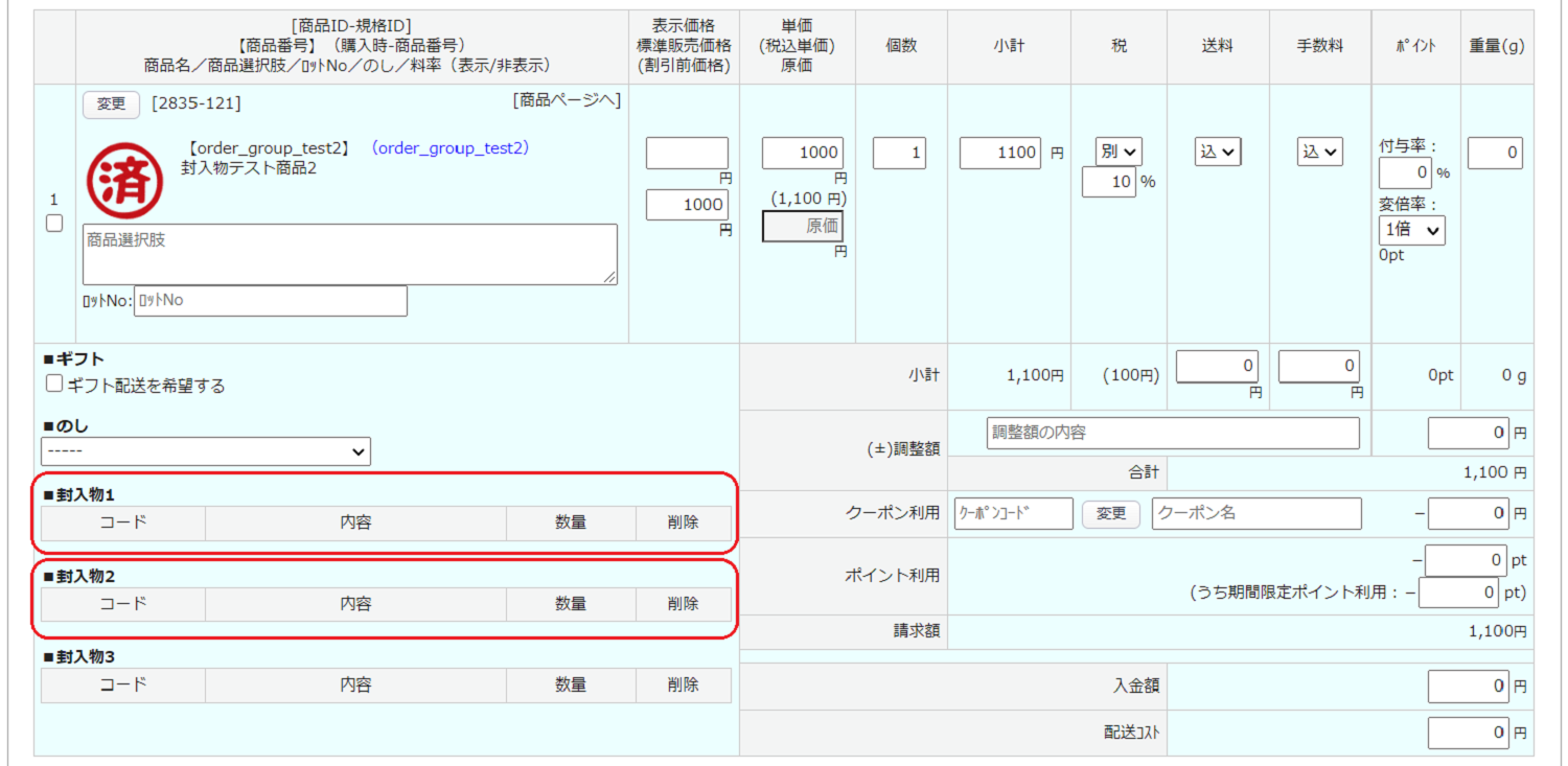 受注データの同梱処理を行い1つにまとめた際に、封入物の再セットを行い、