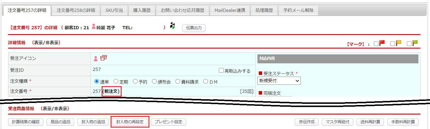 受注編集(受注>受注登録)画面にて、「受注商品情報」の【封入物の再設定】ボタンをクリック