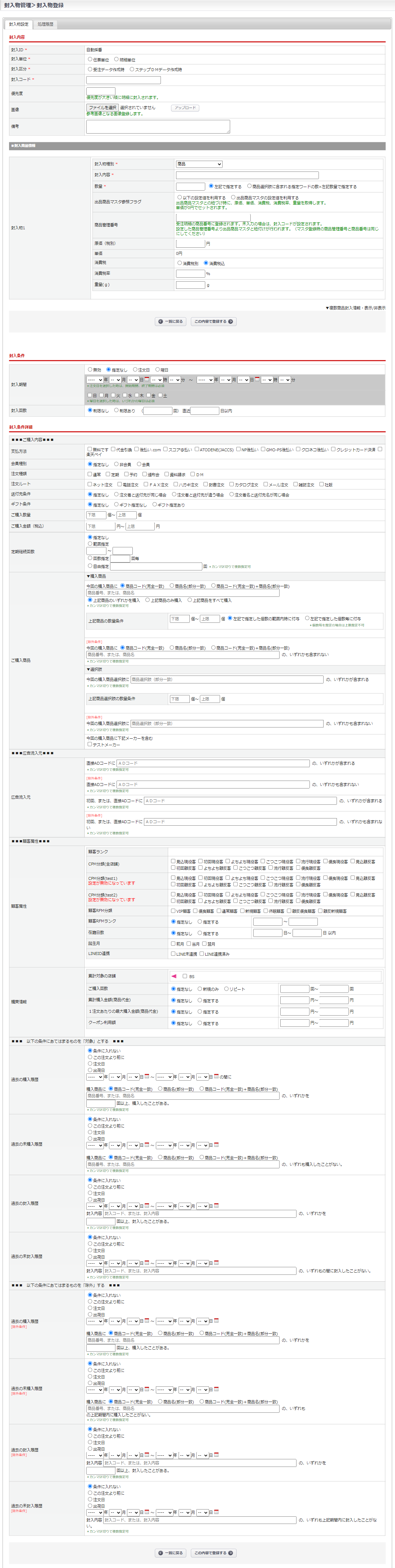 封入物の登録には、「封入内容」「封入商品情報」「封入条件」「封入条件詳細」を設定します。