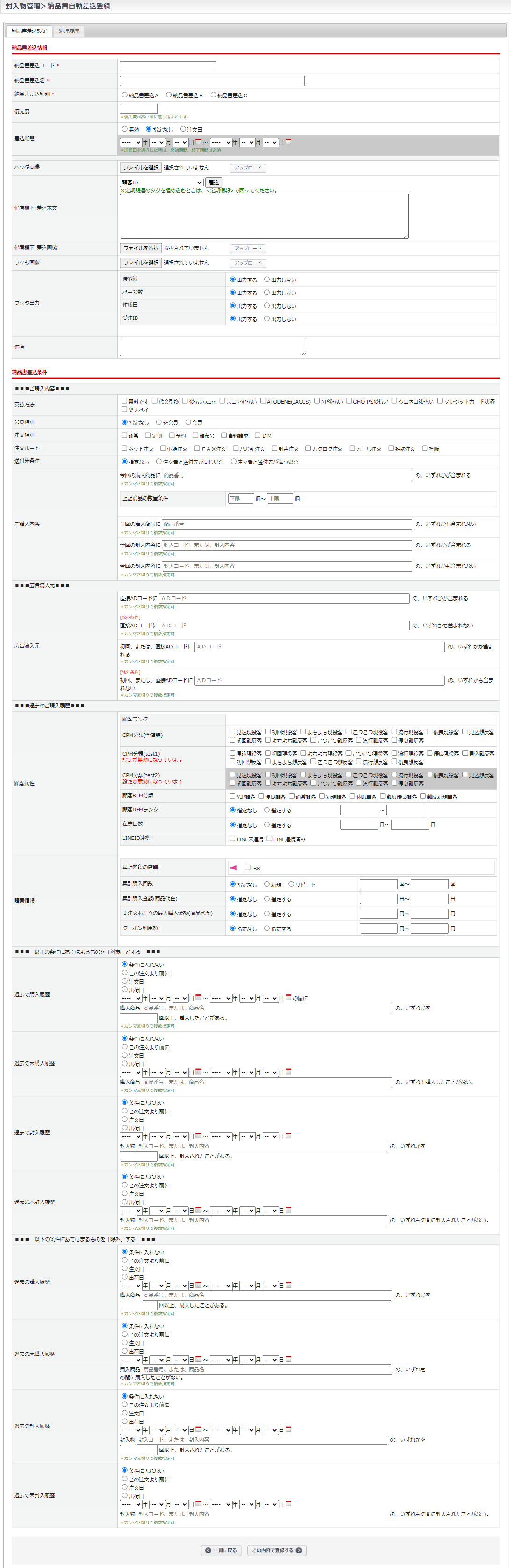 1.受注>封入物管理>納品書自動差込管理 から納品書の差込情報や差込条件を登録します。