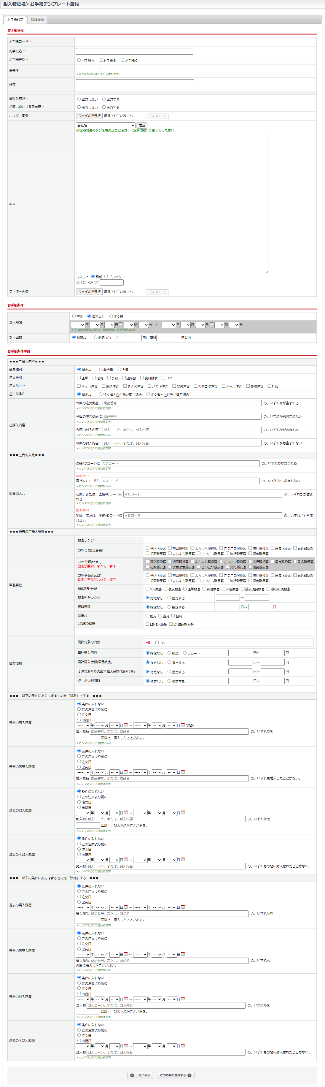 お手紙テンプレートの登録には、「お手紙情報」「お手紙条件」「お手紙条件詳細」を設定します。