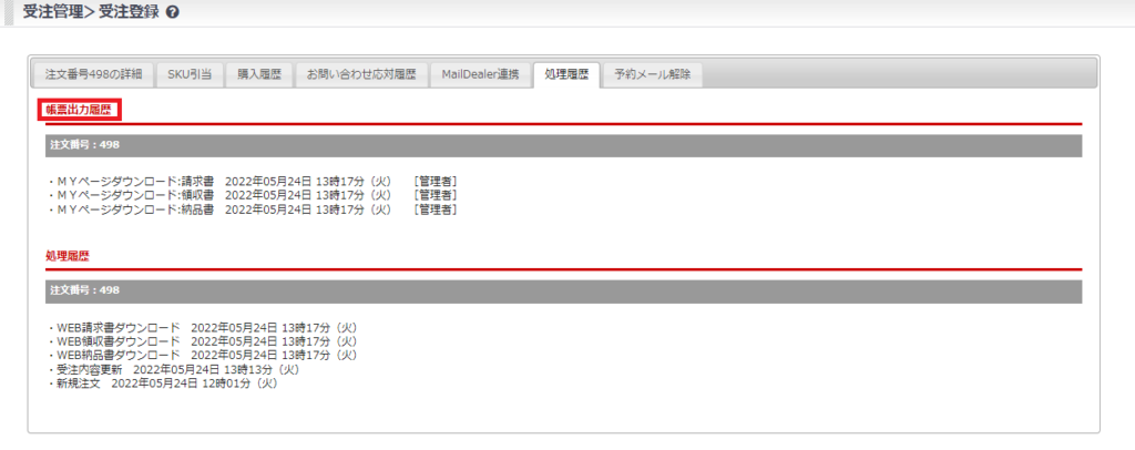 MYページや受注一覧からダウンロードされた伝票(納品書・領収書・請求書)の写しを処理履歴からダウンロードすることができます。