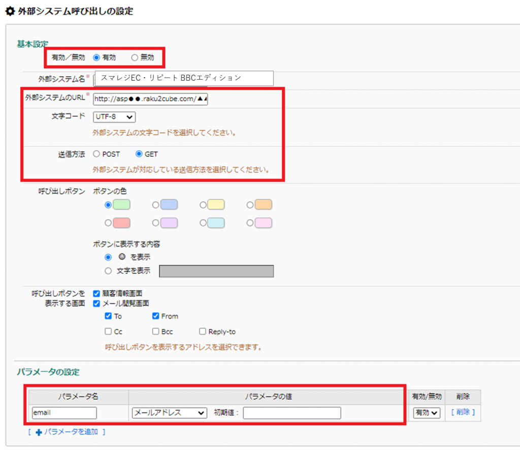 | パラメータの設定* | パラメータ名:email パラメータの値:メールアドレス |