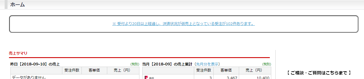 ※注文日から「仮売上」状態のまま一定期間経過するとHOME画面でアラートが表示されます