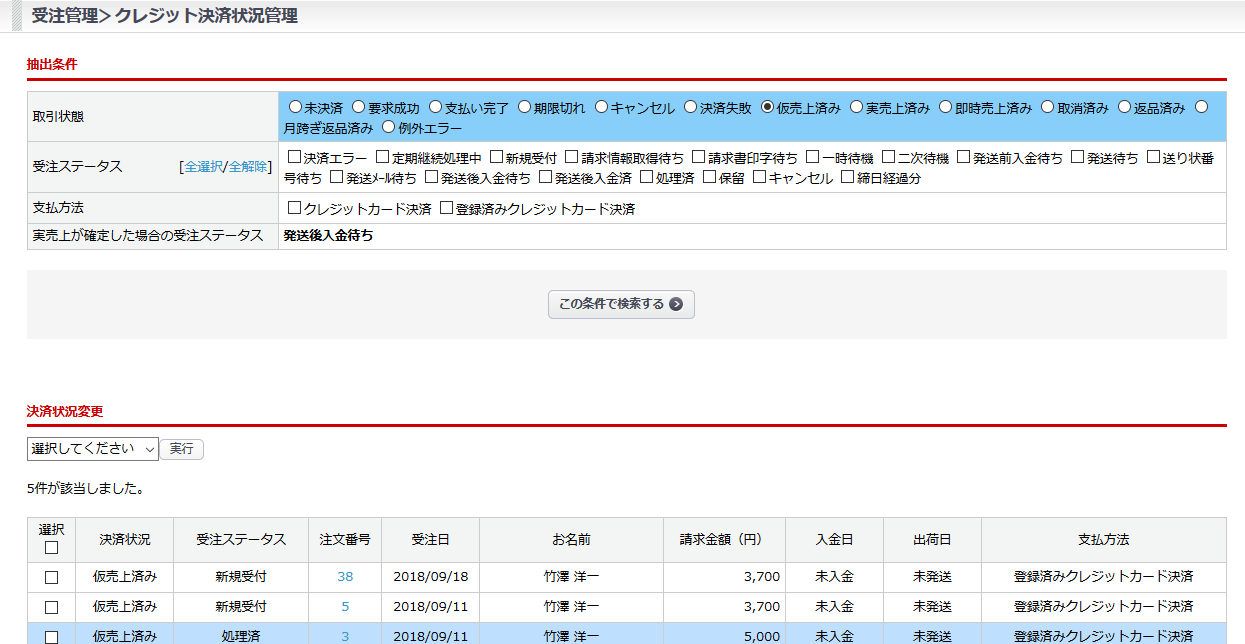 受注管理>クレジット決済状況管理 を開くと、
