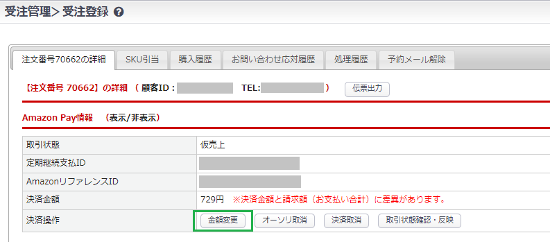 2.Amazon Pay情報の決済操作より、【決済金額変更】ボタンをクリックし、変更完了。