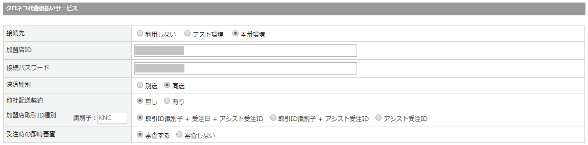 受注時の即時審査:カート上で即時与信をするか否かを設定 ※オプション機能