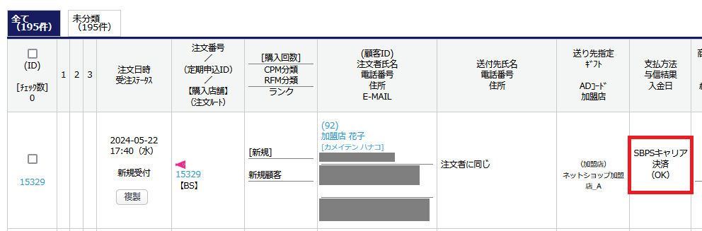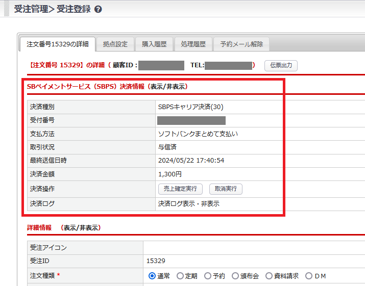 受注登録画面上部に「ソフトバンク・ペイメント・サービス決済情報」が表示されます。