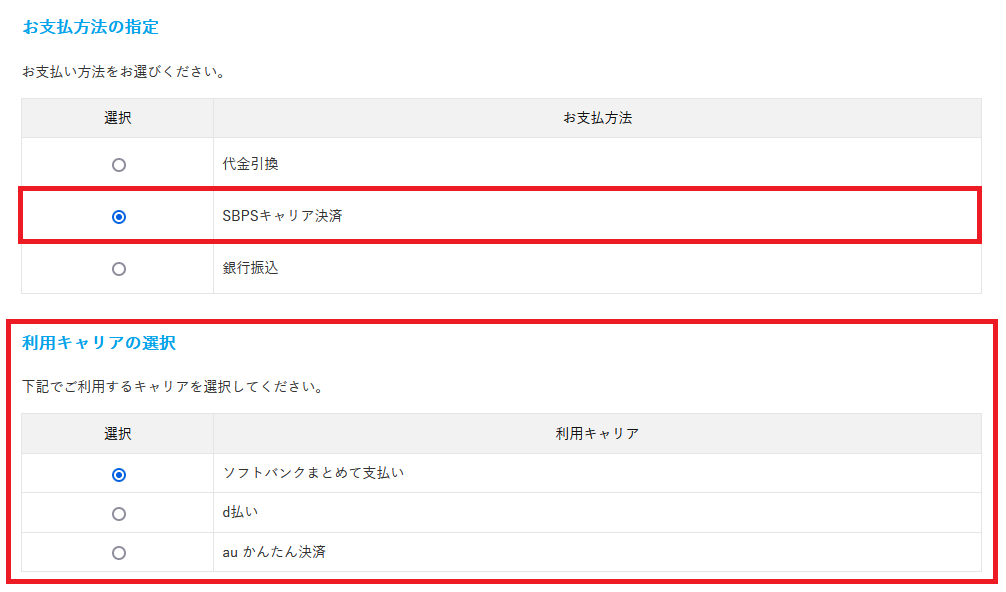 お支払い方法の指定でSBPSキャリア決済を選択すると、利用キャリアの選択欄が表示されます。