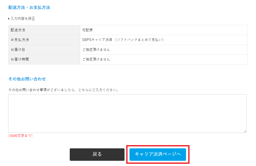 支払方法でSBPSキャリア決済を選択すると、注文確認画面の注文確定ボタンが【キャリア決済ページへ】ボタンに変わります。