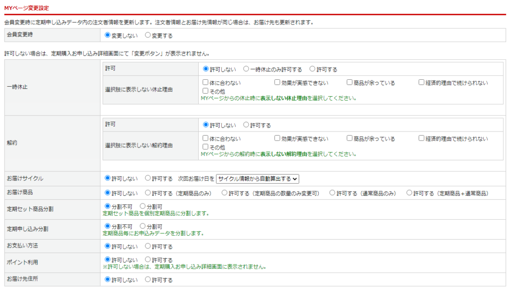 | お届け商品 | 管理画面の受注管理>定期購入お申し込み一覧から編集をされる際、 お届け商品の追加を許可する/しない設定です。 |