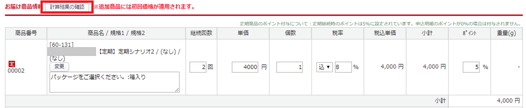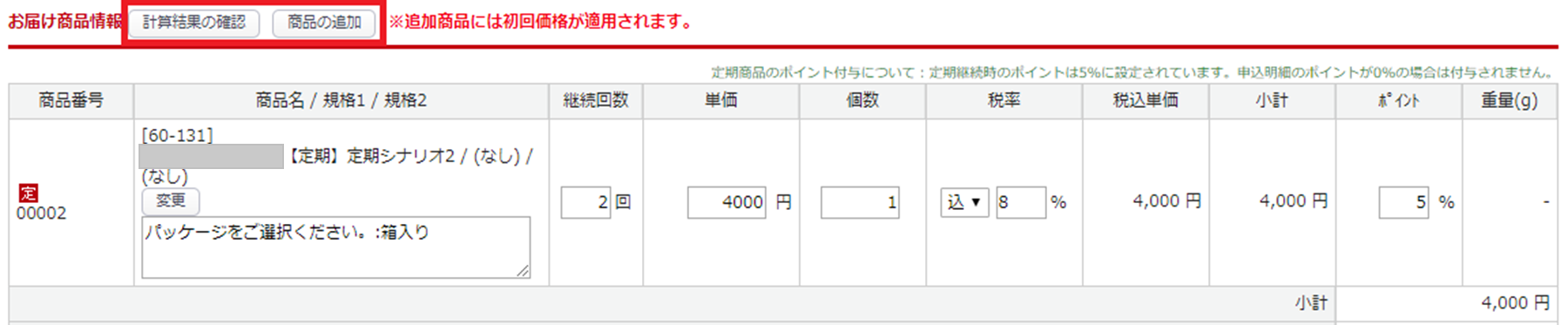お届けサイクルが設定されていない定期商品はお届けサイクル1(デフォルト)が適用されます。