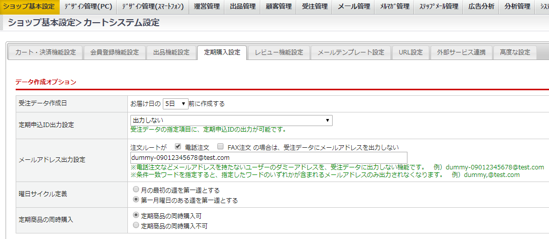 ショップ基本設定>カートシステム設定>定期購入設定>