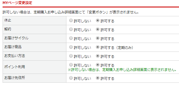 ショップ基本設定>カートシステム設定>定期購入設定>MYページ変更設定