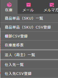 | 3 | 棚卸CSV登録 | 棚卸のCSV登録を行います。 棚卸を実施して得られた実在庫の状況をアップロードします。 |