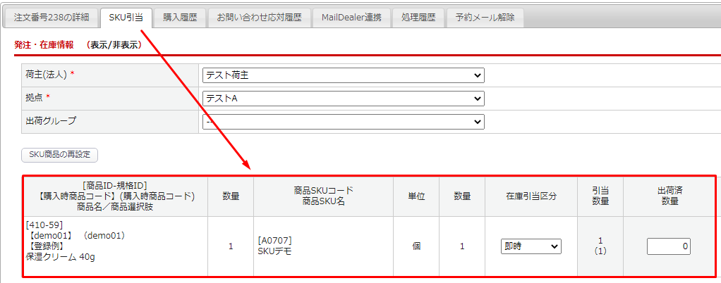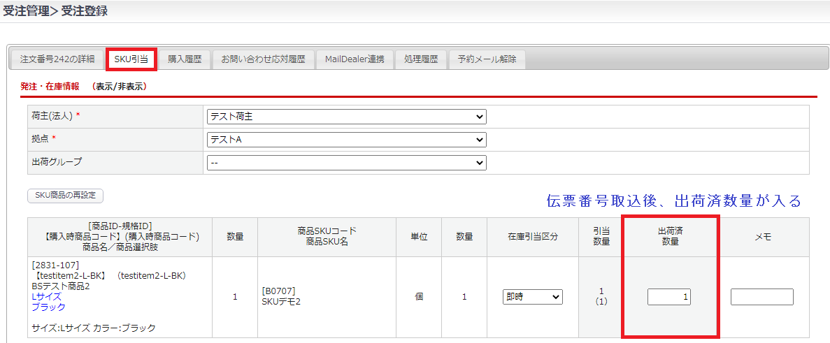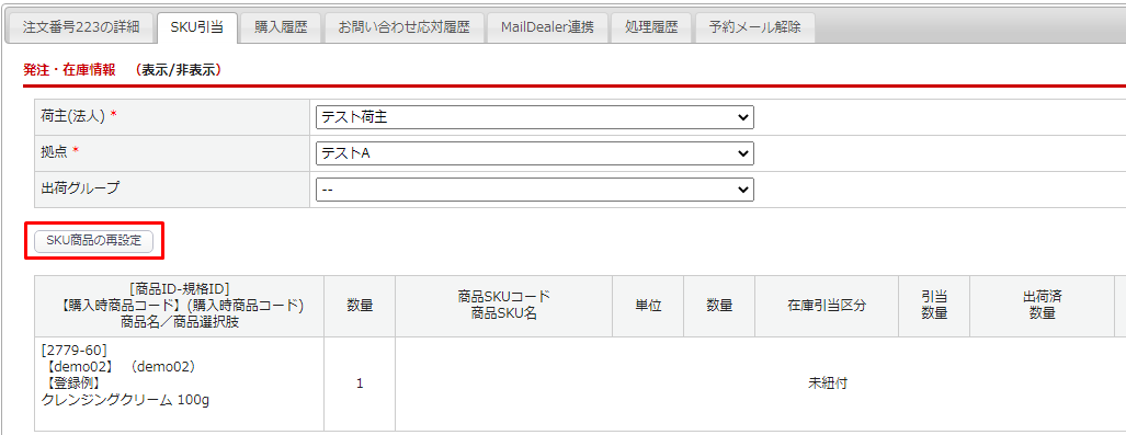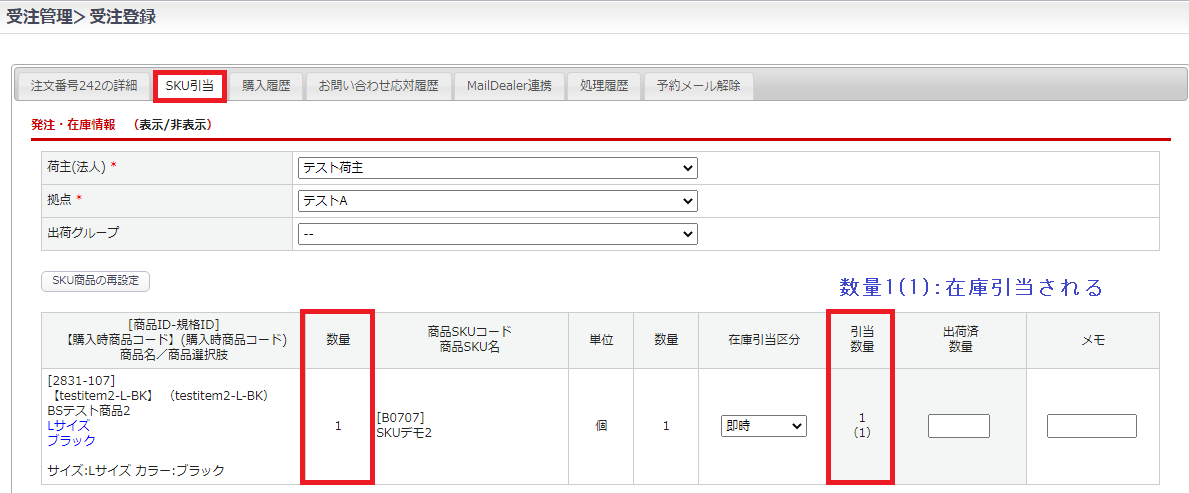 ➡商品SKUの登録、および、商品マスタ紐付けを行った後、受注管理>受注登録>「SKU引当」タブにて