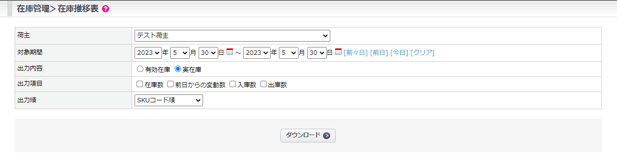 対象期間の在庫数の推移をCSVデータファイルでダウンロードできます。