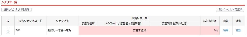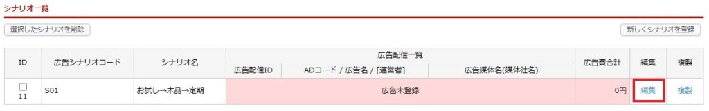 広告分析>広告シナリオ登録 シナリオの編集ボタンから