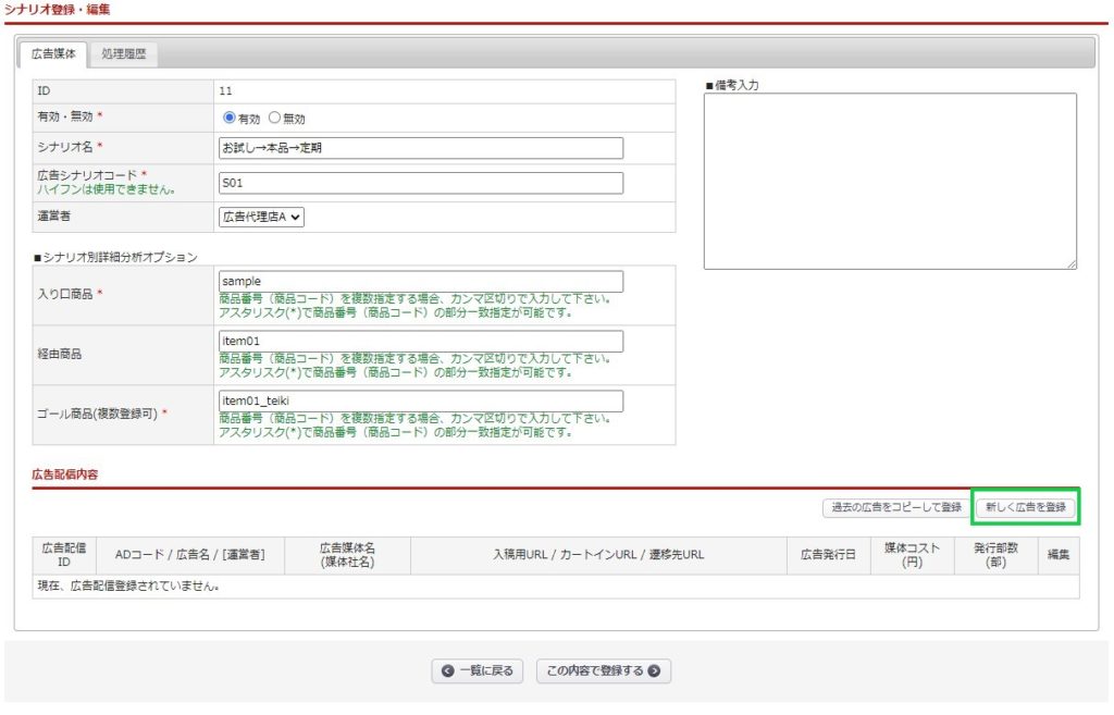 広告分析>シナリオ一覧>【新しくシナリオを登録】ボタンをクリックすると、