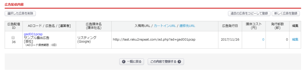 広告の登録へは、【一覧に戻る】ボタンをクリックし、一覧へ移動して下さい。