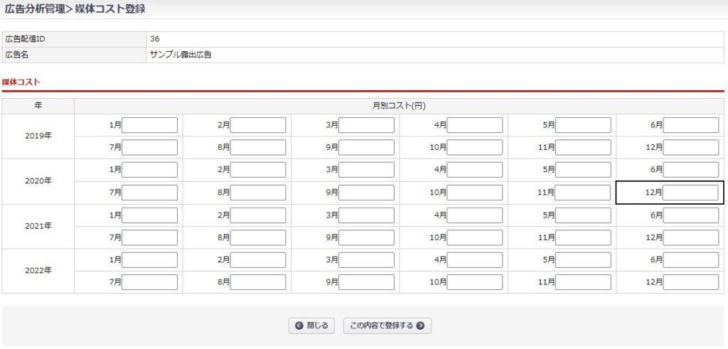 | 媒体コスト(コスト登録ボタン) | 毎月かかったコストを登録します。 |