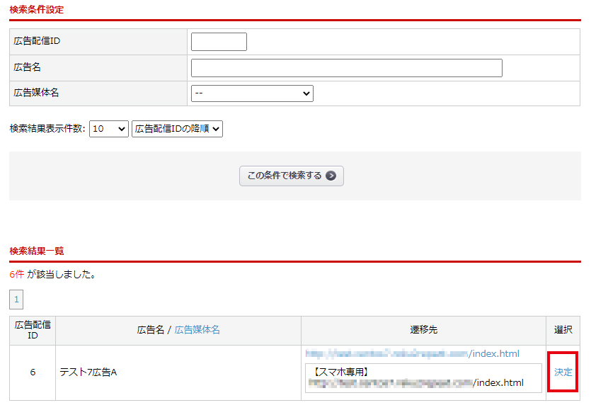 検索条件設定 で条件を入力し、【この条件で検索する】をクリックすると、[検索結果一覧]に登録済の広告が表示されます。